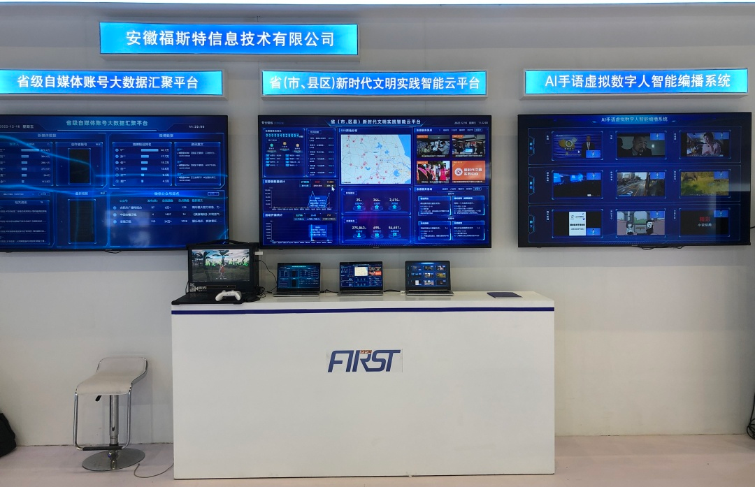 安徽福斯特信息技術(shù)有限公司此次應(yīng)邀參展,以廣電媒體發(fā)展為亮點(diǎn),集中展示大數(shù)據(jù)、人工智能呈現(xiàn)了AI-VLOG視頻智能合成系統(tǒng)+AI手語(yǔ)虛擬數(shù)字人智能編播系統(tǒng)+省級(jí)自媒體賬號(hào)大數(shù)據(jù)匯聚平臺(tái)+省(市、縣區(qū))新時(shí)代文明實(shí)踐智能云平臺(tái)技術(shù)。